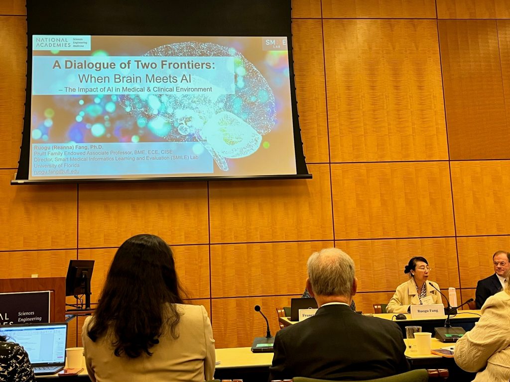 Dr. Ruogu Fang was invited to present at The National Academies’ Workshop on Bidirectionality between AI and Neuroscience. The invitation comes from The National Academies Forum on Neuroscience and Nervous System Disorders, organizing a hybrid workshop titled “Exploring the Bidirectional Relationship between Artificial Intelligence and Neuroscience.” The workshop occurred on March 25-26, 2024, in Washington, D.C.